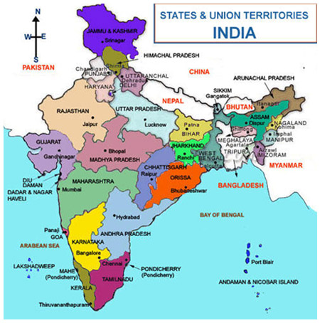 Административное деление: Индия делится на 28 штатов, шесть союзных территорий и Национальный столичный округ Дели. Каждый штат имеет собственное избираемое правительство и в свою очередь подразделяется на районы (дистрикты). Союзные территории управляются администратором, назначаемым союзным правительством. Впрочем, некоторые союзные территории имеют собственные избираемые правительства.