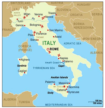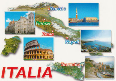 Основные города и курорты: Рим, Милан, Турин, Генуя, Венеция, Болонья, Флоренция, Неаполь.